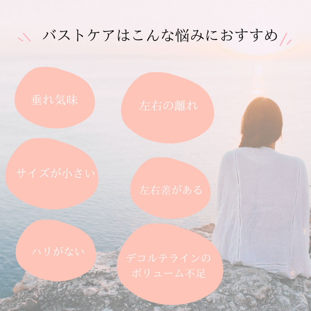 当サロンでのバストケアは、リンパの流れを整え、血行を促進し、デコルテから胸元まで美しく見せる効果が期待できます!また、ただバストを整えるだけでなく、肩こりや背中のハリの改善やメリハリのあるボディーラインを作ります。